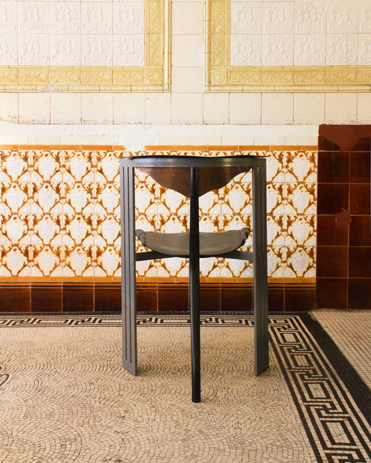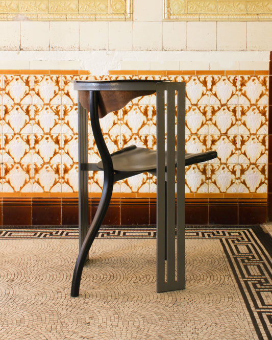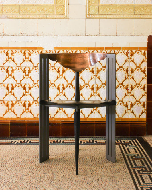 A limited-edition chair designed by Borek Šípek for Vitra in the 1980s. The piece reflects Šípek’s distinctive postmodern language, blending sculptural form with neo-baroque references. Crafted from coated steel and blackened wood, the chair is punctuated by a hammered copper backrest, introducing both texture and ornament.