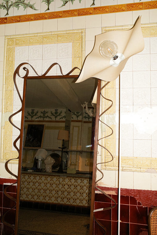 A sculptural floor lamp by Italian designer Mario Bellini, featuring a slender stem that supports a gently ruffled shade, reminiscent of a flower in bloom. The head and shade are mounted on an adjustable joint, allowing the light to be directed with ease.