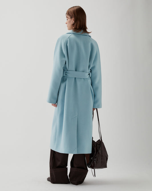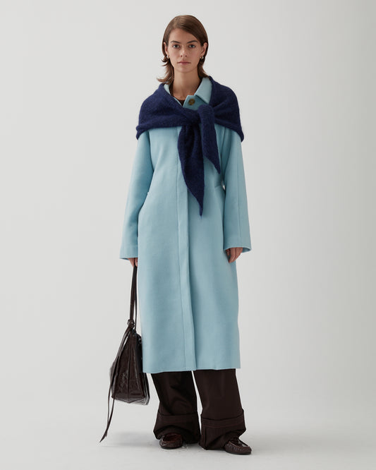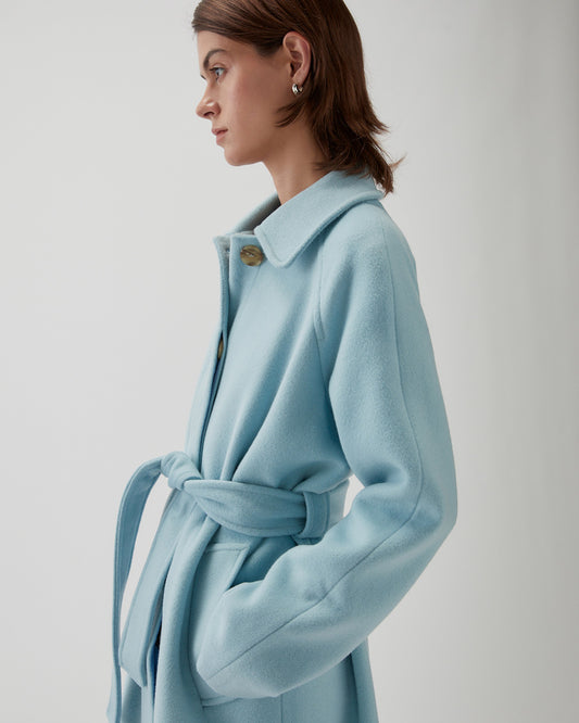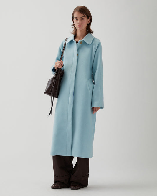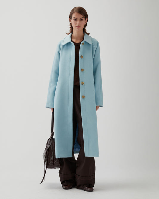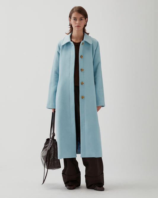 The Alice Coat in Wool Blue features a longline, structured silhouette with clean details—side pockets, button-front closure, and a matching belt. Its timeless design makes it ideal for layering, adding modern, effortless style to any outfit.