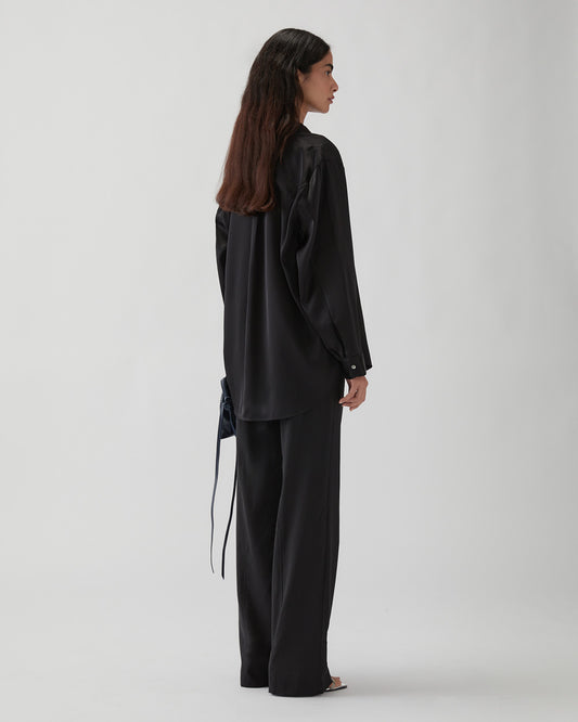 The Ellis Shirt in Duchesse Satin Black features a relaxed fit with a soft sheen and elegant button details. Crafted from a duchesse satin, it offers a comfortable and versatile unisex option. Style it with the Cathy Trousers for a coordinated, sophisticated outfit.