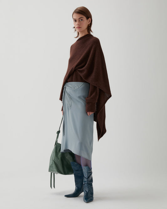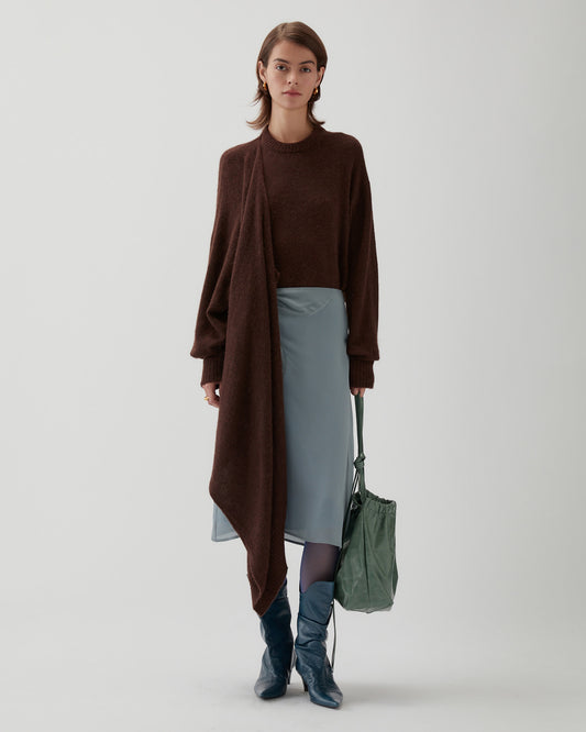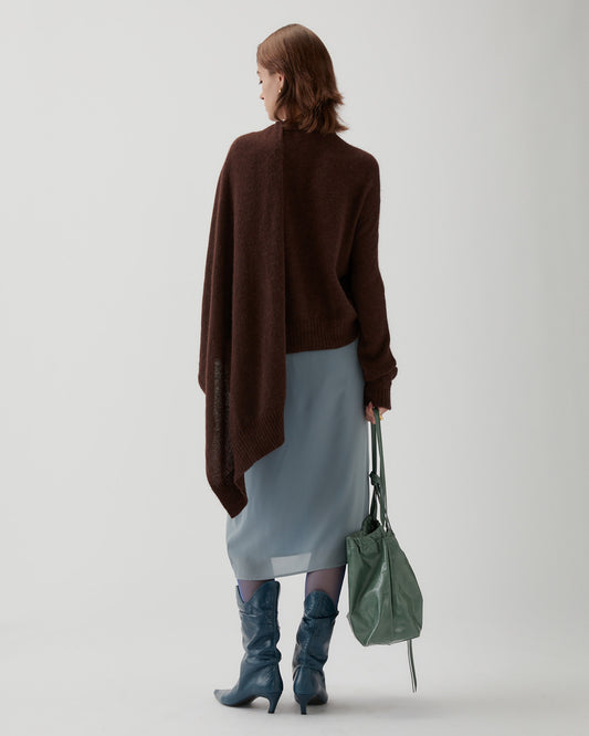 The Rejina Pyo Colette Sweater is a signature piece crafted from a luxurious alpaca blend, offering exceptional warmth and a soft, lightweight feel. Designed with an oversized fit, it features a distinctive draped front and a unique scarf-like detail that can be styled elegantly draped over the shoulders or worn down elegantly.