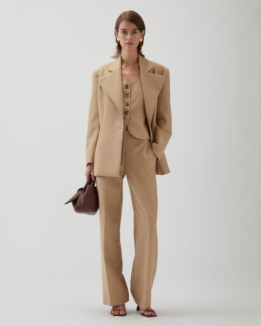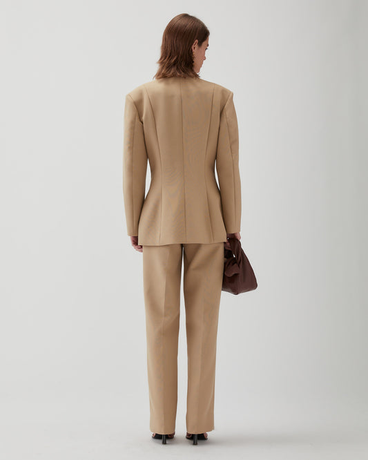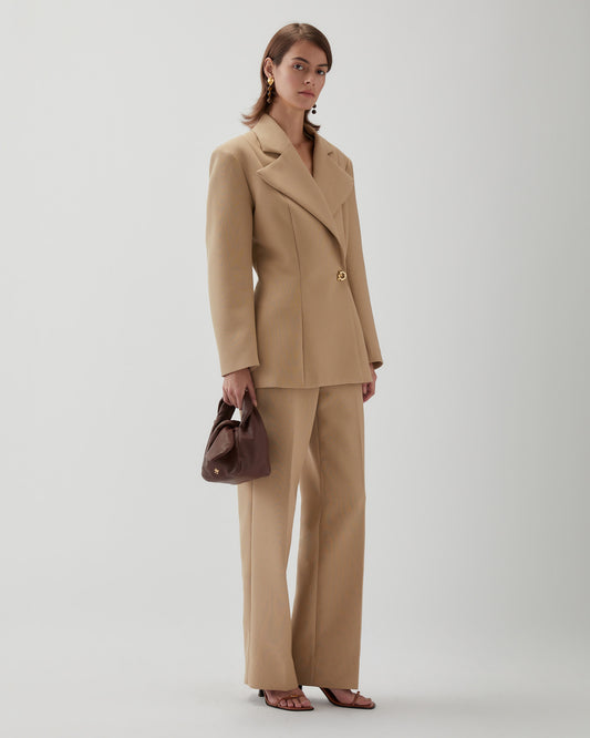 The Leila Blazer in Cotton Silk Double-face Beige offers a sharp, tailored fit with a soft, natural drape. Its signature button and structured shoulders create a refined silhouette, perfect for both professional and casual settings.