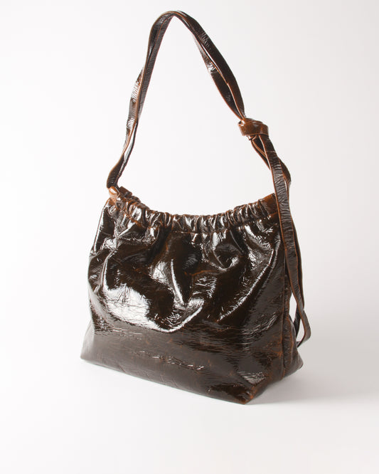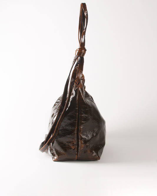 The Felix Tote in Italian Wool Laminated Brown is a slouchy, oversized shoulder bag with double straps featuring a knotted tie detail. Soft yet comfortable to carry for all occasions, you can throw it over your shoulder or wear it as a crossbody throughout a busy day. It features a magnetic closure, adding convenience, making it a perfect work bag that accommodates all your essentials and more.