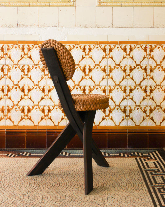 A tripod rope chair by Adrien Audoux and Frida Minet, designed in France during the 1950s. Characteristic of the duo’s modernist sensibility, the piece pairs a restrained wooden frame with hand-woven rope, resulting in a sculptural form that balances utility and texture.
