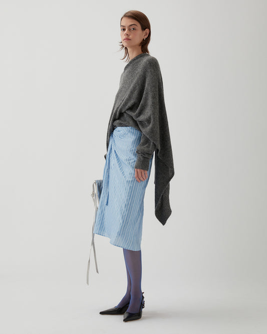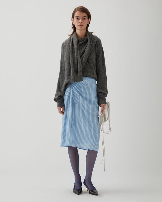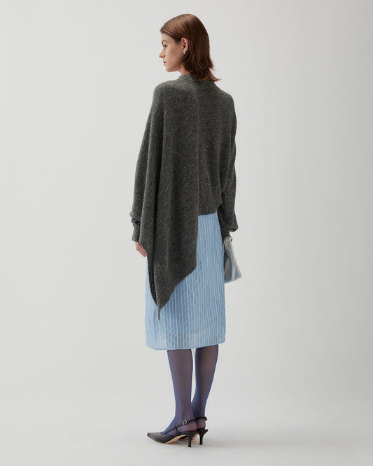 The Rejina Pyo Colette Sweater is a signature piece crafted from a luxurious alpaca blend, offering exceptional warmth and a soft, lightweight feel. Designed with an oversized fit, it features a distinctive draped front and a unique scarf-like detail that can be styled elegantly draped over the shoulders or worn down elegantly.
