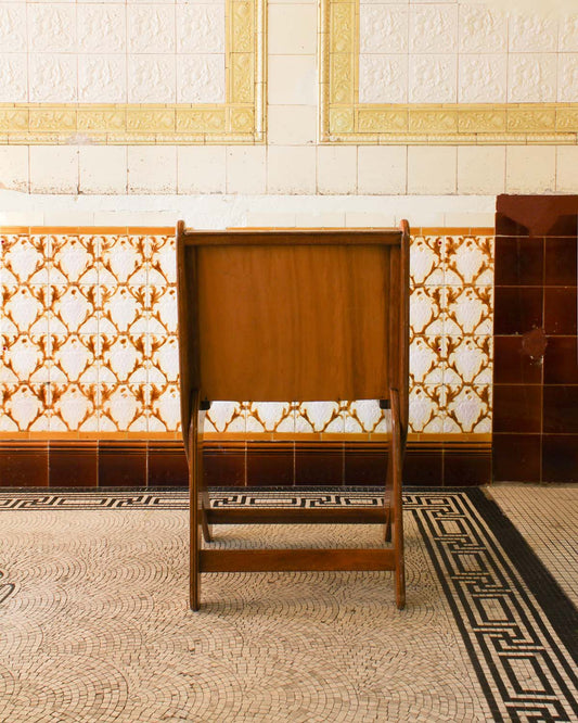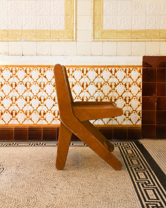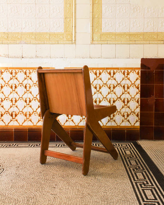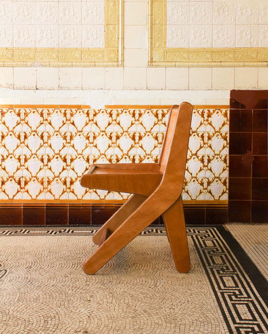 A Danish vintage wooden chair defined by clean lines and solid craftsmanship. Made from solid wood, it features a gently reclined backrest and angled legs that create a strong, architectural silhouette.