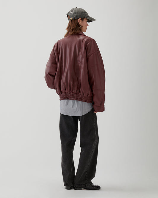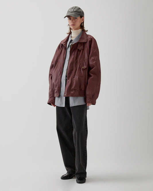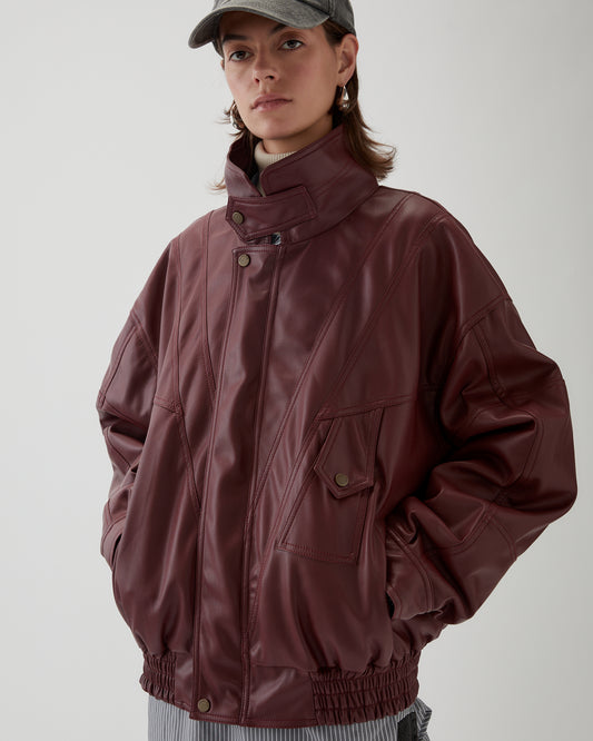 An oversized biker jacket in structured faux leather, featuring a high, snap-fastening neck, drop shoulders, and side pockets. A double-ended zip fastening and seam detailing throughout create a subtle reconstructed effect, giving the jacket a modern, architectural edge.